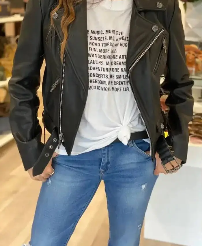 Chrome Hearts is a famous fancy brand known for making excellent leather stuff, fancy jewelry, and cool clothes. It was started in 1988 by Richard Stark. People like it a lot because it has unique and edgy designs. They use fancy silver stuff and special symbols like crosses and daggers in their things: many fashionable people, famous folks, and musicians like this brand. The Chrome Hearts Black Leather Jacket is a super fancy jacket made with a lot of skill and style. After getting inspired by it, we, Leather Jacket Black, made it from genuine leather, so it’s not just clothing; it’s a way to show your style and a symbol of luxury. Inside, we lined a soft viscose lining to keep you comfy and warm so you can wear it in different kinds of weather. It has many pockets on the sides and inside, so you can carry your essential stuff and keep your hands warm. The sleeves are long, look fantastic, and protect you from the weather. It has a belt around the waist that makes it unique and lets you adjust how it fits you. This jacket is always in style, showing you’re brave and like adventure. The notch collar looks tough and cool, adding to how it looks. The zippers on the cuffs can be adjusted to make it more comfy on your wrists. It closes with a unique zipper that’s not straight, giving it a cool look. You can wear it open or closed. This jacket is black, which means it goes with lots of different clothes, so you can wear it to fancy events or hang out.