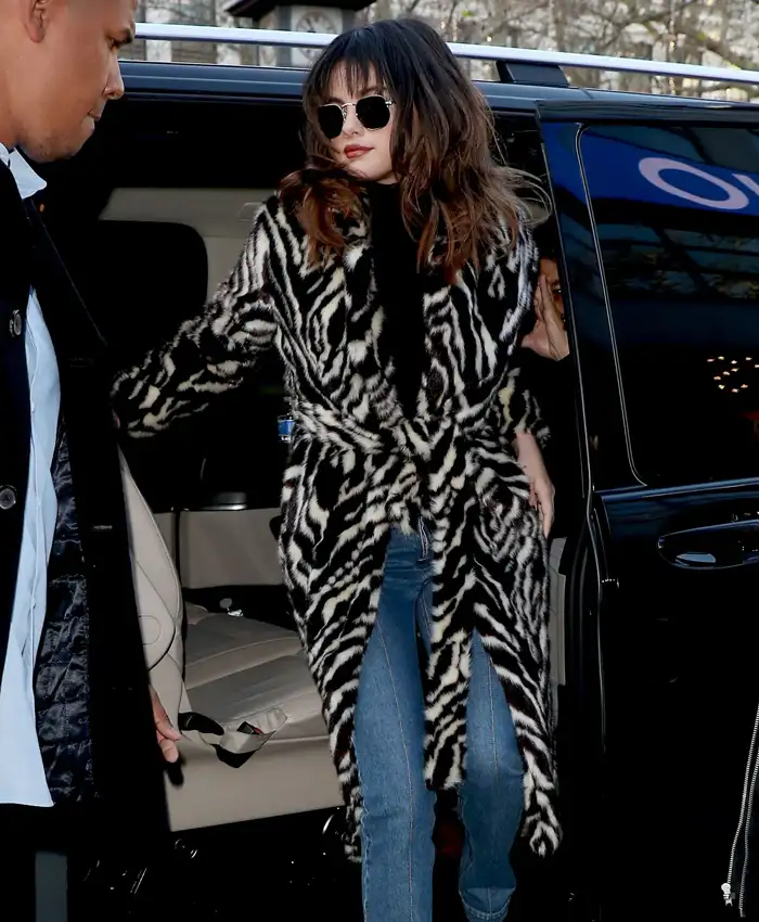 This Selena Gomez Black Fur Belted coat is specially designed for beautiful girls. Leather jacket Black has designed this coat with fur material, and the inner fabric of this coat is viscose lining. The collar style of this coat is intended to be notched lapel collar. Open hem cuffs are designed for this coat. There are two pockets designed outside of this coat, and two pockets are intended inside of this coat. The front closure of this jacket is open with a wraparound belt closure. The color of this stylish fur coat is beautiful, which is black and white.